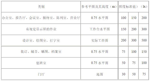 根据各类建筑不同活动或作业类别,将照度标准规定为高、中、低三个值。设计人员应根据建筑等级、功能要求和使用条件,从中选取适当的标准值,一般情况下应取中间值。